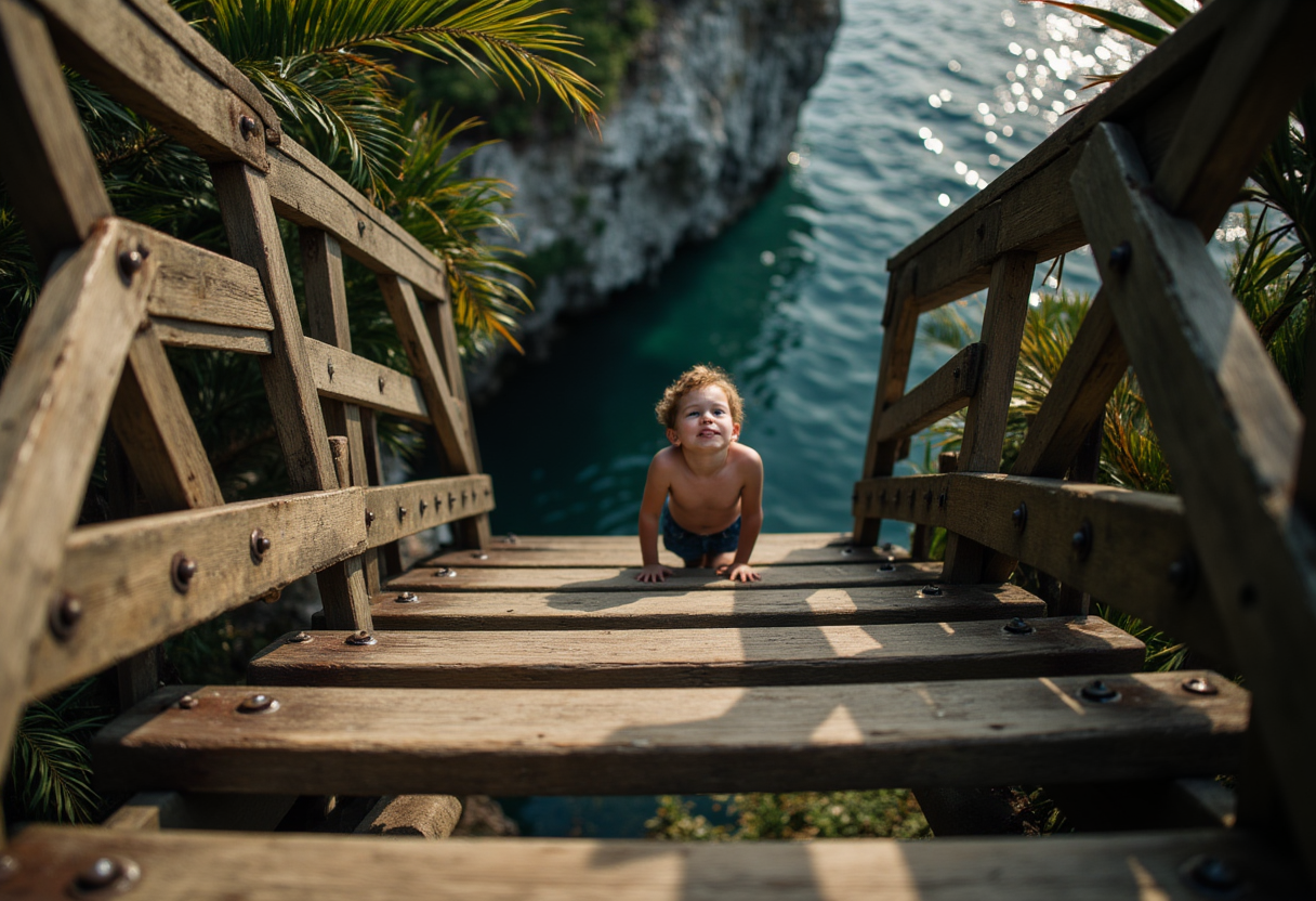 A young boy standing on a rickety wooden staircase leading down into a dark, mysterious hole