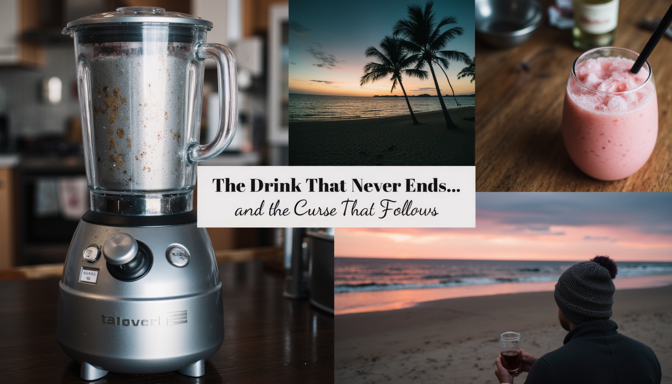 A silver blender, a frosty pink drink with condensation, a tropical sunset, and a man in a wool beanie on a beach.