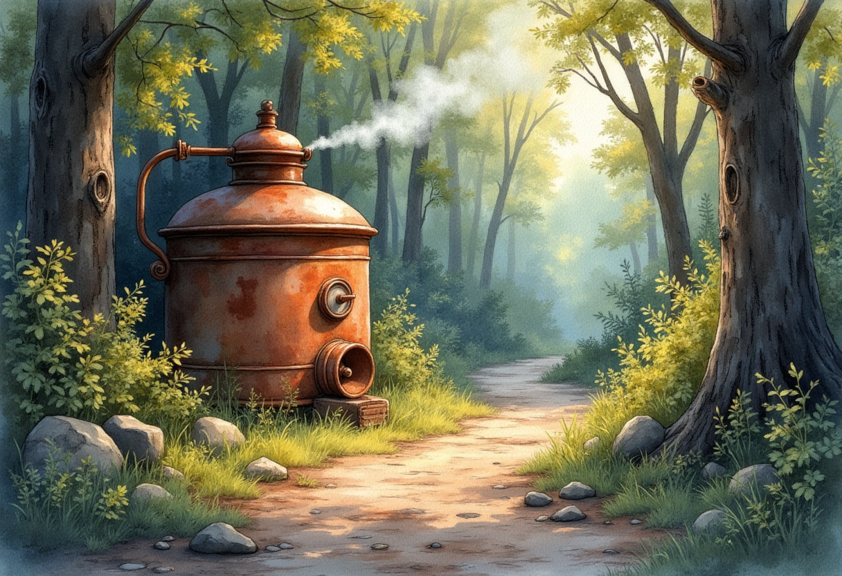 “Illustration of a concealed moonshine still in a wooded ravine”