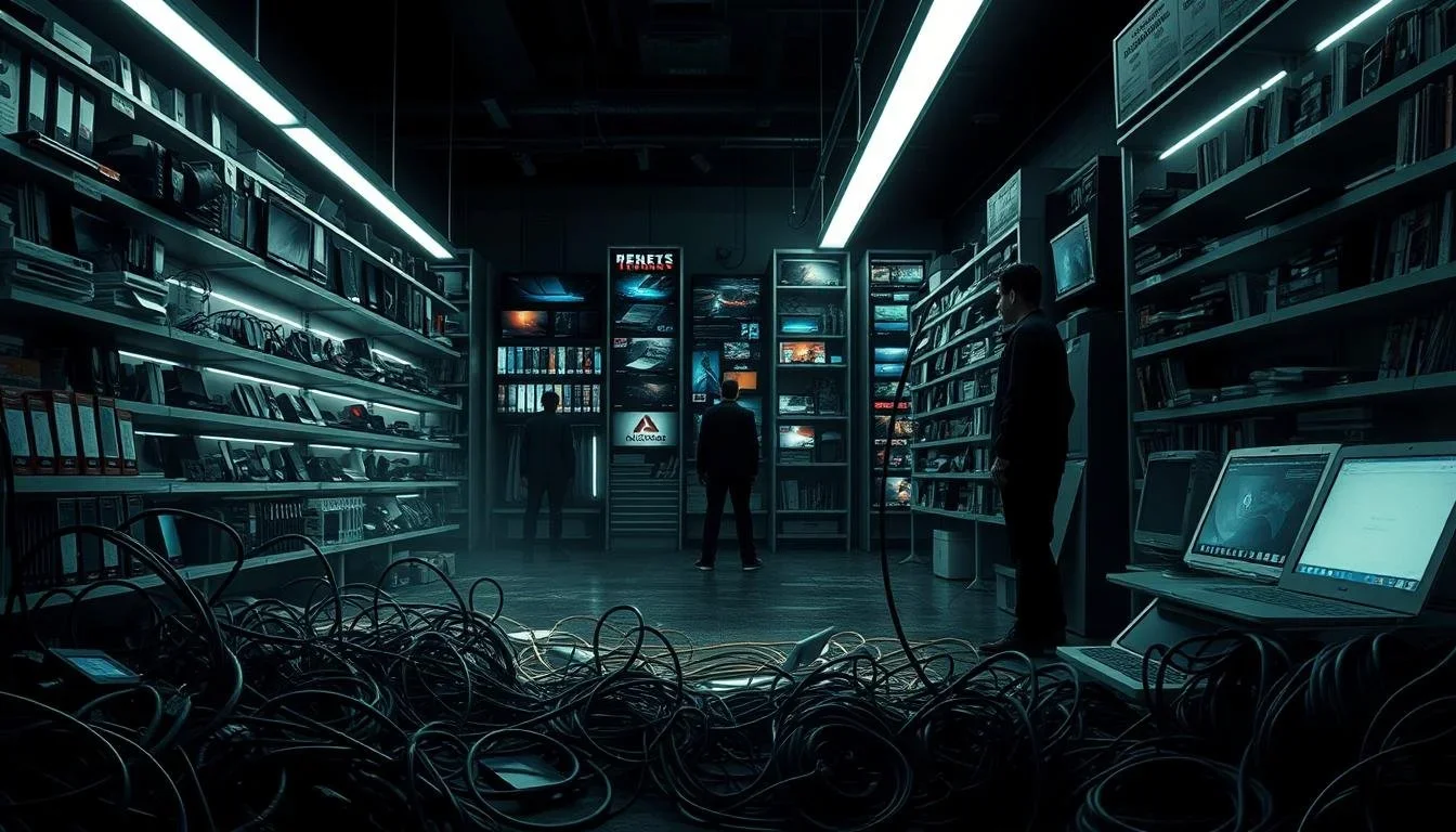 A dimly lit electronics store, its shelves overflowing with a dizzying array of gadgets and gizmos. The fluorescent lighting casts a harsh, clinical glow, casting long shadows that lend an ominous atmosphere. In the foreground, a maze of tangled cables and cords snakes across the cluttered floor, threatening to ensnare the unwary shopper.