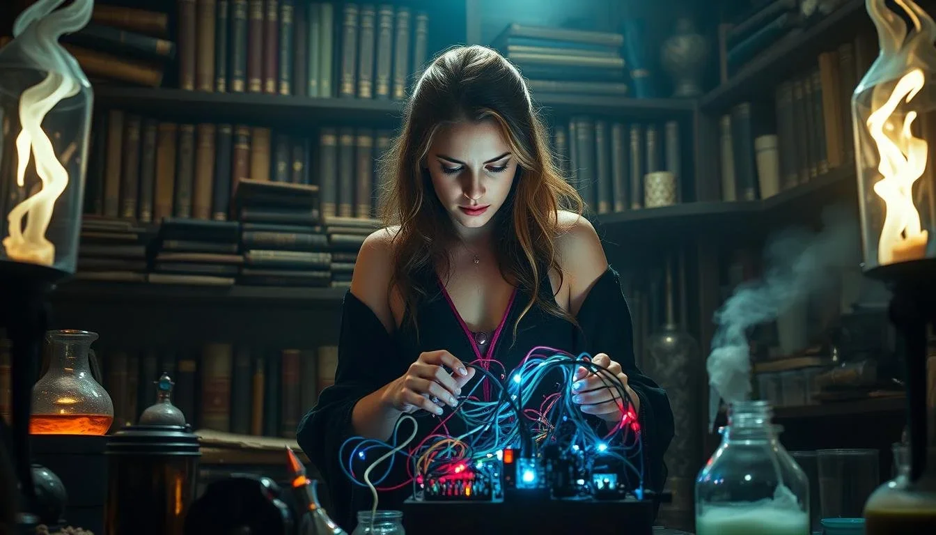 Soft, dramatic lighting casts dramatic shadows, emphasizing the sorceress's intense focus and the arcane nature of her endeavor. The background is filled with the tools of her trade - bubbling potions, alchemical apparatus, and the faint glow of magical runes. An air of concentration and determination permeates the scene, as the sorceress endeavors to blend her arcane arts with modern technology.