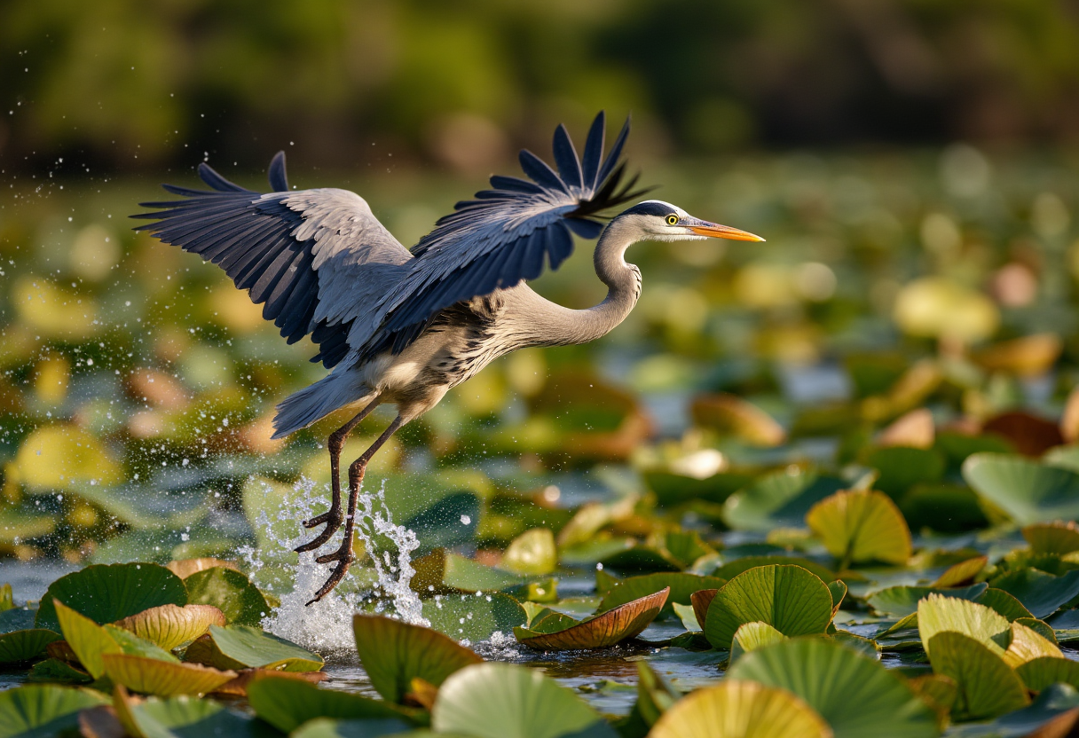 a single Great Blue Heron taking flight from a cluster of vibrant green lily pads