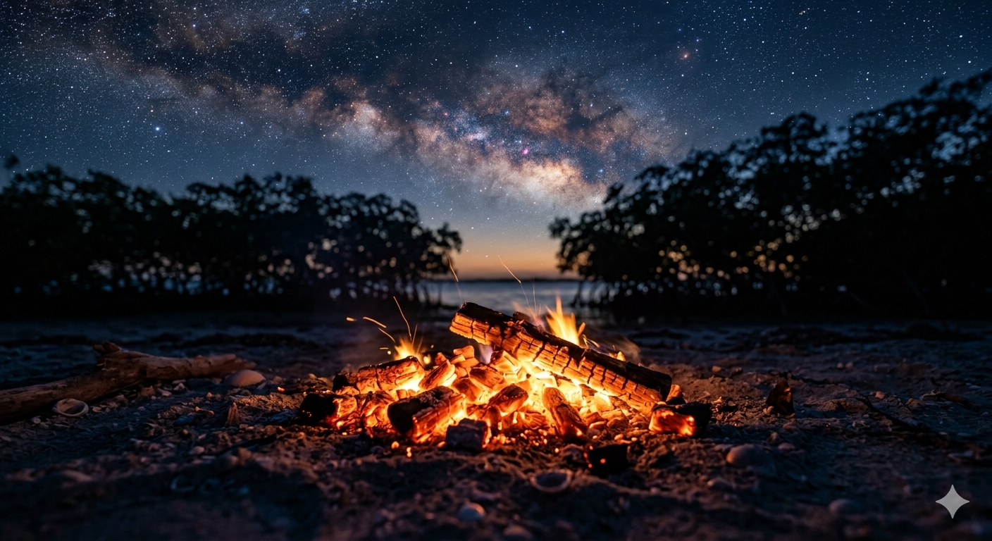 The campfire, built with salvaged, salt-soaked driftwood and carefully guarded from the humidity,