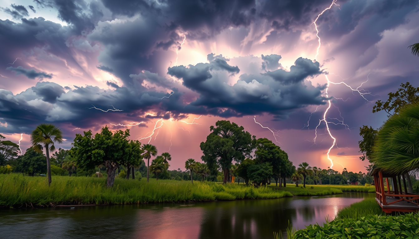 Massive thunderstorm over Florida landscape, lightning, dark clouds