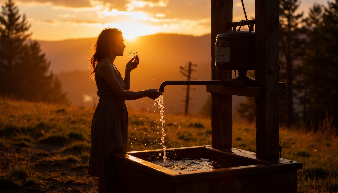 a well-used, rustic artesian well behind her cabin. She is splashing a handful of cool water onto her face